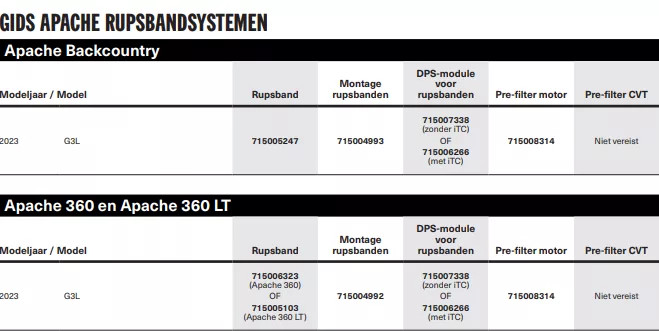 - Apache 360 en 360 LT montagekit en pre-filters voor motor- en luchtinlaat zijn vereist.