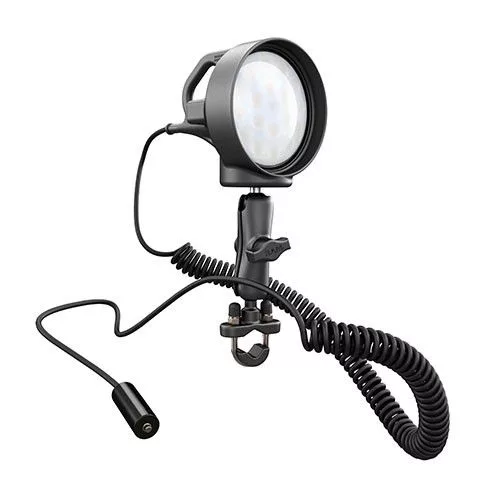 •  Schijnwerper met 540 lux led-verlichting (9 W) voor zwaar gebruik, standaard geleverd met een dubbel kogelscharnier met een diameter van 2,5 cm, bekleed met rubber.